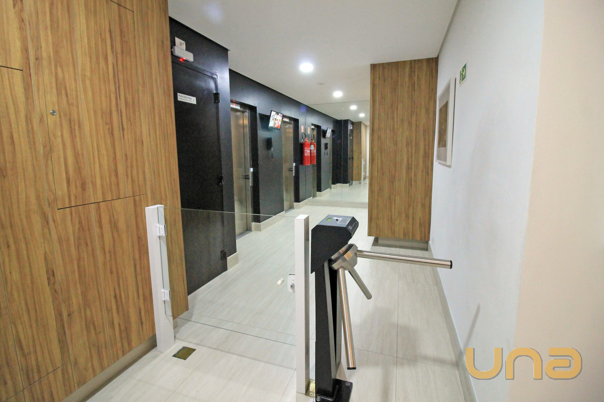 * Prédio novo, portaria com catraca de acesso.